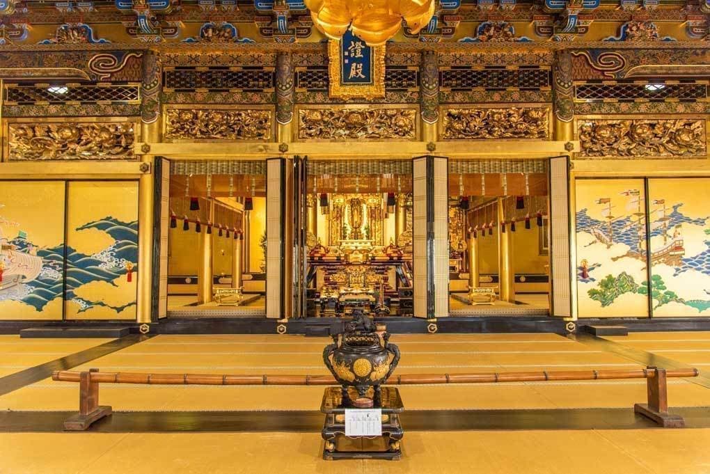 現在の本堂は、文政8年(1825年)に再建され、現存する堺最大の木造建築物です。正面に阿弥陀如来、向かって右に親鸞聖人、左に蓮如上人が鎮座しています。堂内の内陣と外陣を仕切る襖絵には、中世の自由都市堺を彷彿させる南蛮貿易図が描かれています。